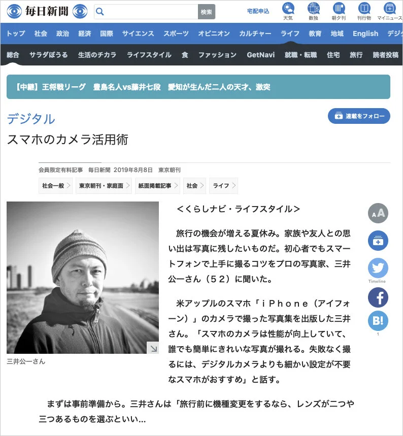毎日新聞に「スマホのカメラ活用術」というテーマで掲載されました。進化するスマートフォンは一番手軽なデジタルカメラですね。